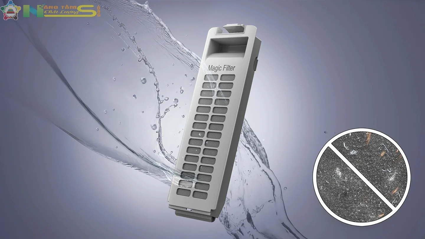Máy giặt Samsung được trang bị hộp đánh tan bột giặt Magic Dispenser với cánh quạt xoay và tia nước mạnh mẽ. Tính năng này giúp đánh tan bột giặt trước khi đi vào lồng giặt, giảm tình trạng cặn bột giặt bám trên quần áo sau khi giặt và tranhs máy giặt không xả nước.