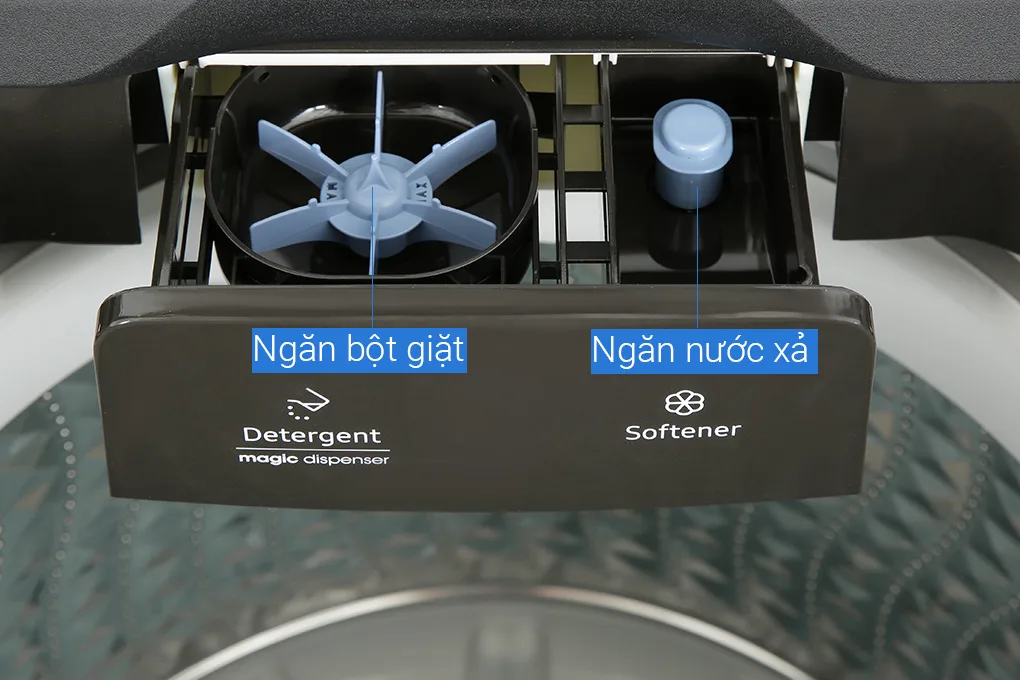 Bột giặt còn lưu lại và không được đánh tan có thể gây ngứa và dị ứng trên quần áo, điều này làm nhiều người lo lắng. Tuy nhiên, máy giặt Samsung Inverter 11kg WA11T5260BV/SV với hộp đánh tan bột giặt Magic Dispenser sẽ giải quyết vấn đề này. Hộp đựng bột giặt có cánh quạt xoay tạo ra dòng nước xoáy mạnh để đánh tan hoàn toàn bột giặt trước khi đổ xuống lồng giặt.
