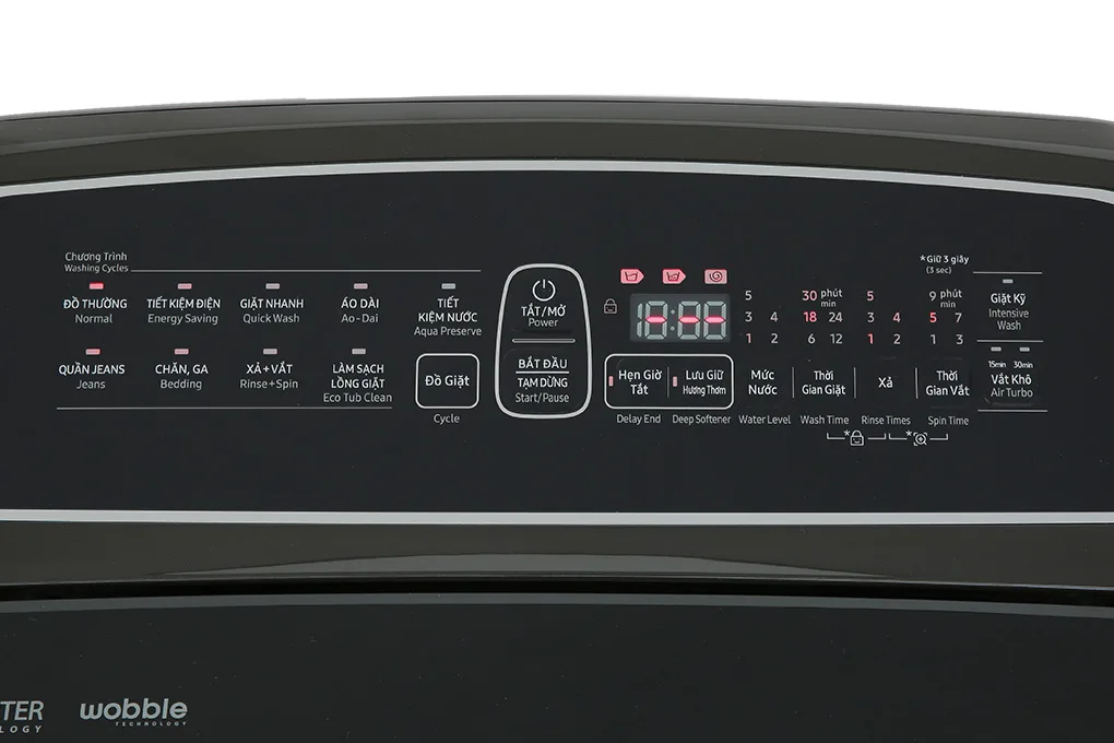 Máy giặt Samsung Inverter 11kg WA11T5260BV/SV được trang bị bảng điều khiển tiếng Việt, giúp việc sử dụng trở nên dễ dàng và thuận tiện. Ngoài ra, máy còn có 9 chương trình giặt nổi bật, bao gồm: giặt nhanh, giặt chăn ga, giặt áo dài, giặt thường, tiết kiệm điện, tiết kiệm nước, đồ jean, xả + vắt, và vệ sinh lồng giặt.