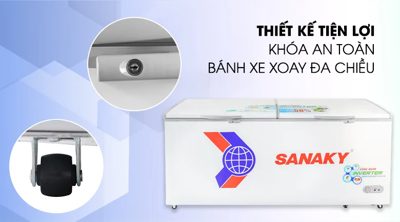 Tủ đông Sanaky VH-8699HY được thiết kế với bánh xe chịu lực tốt, giúp người dùng dễ dàng di chuyển tủ đến vị trí mong muốn. Điều này không chỉ mang lại sự tiện lợi trong việc sắp xếp không gian, mà còn giúp dễ dàng vệ sinh và duy trì khu vực xung quanh tủ sạch sẽ tránh tủ đông chạy ngắt liên tục.