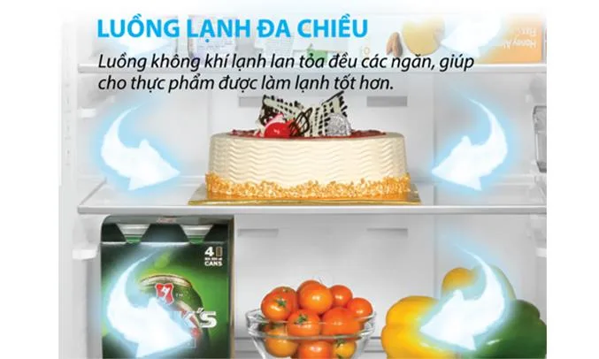 Luồng lạnh đa chiều với luồng khí lạnh được tỏa đều khắp không gian tủ nhanh chóng cho thực phẩm được bảo quản tươi lâu hơn.