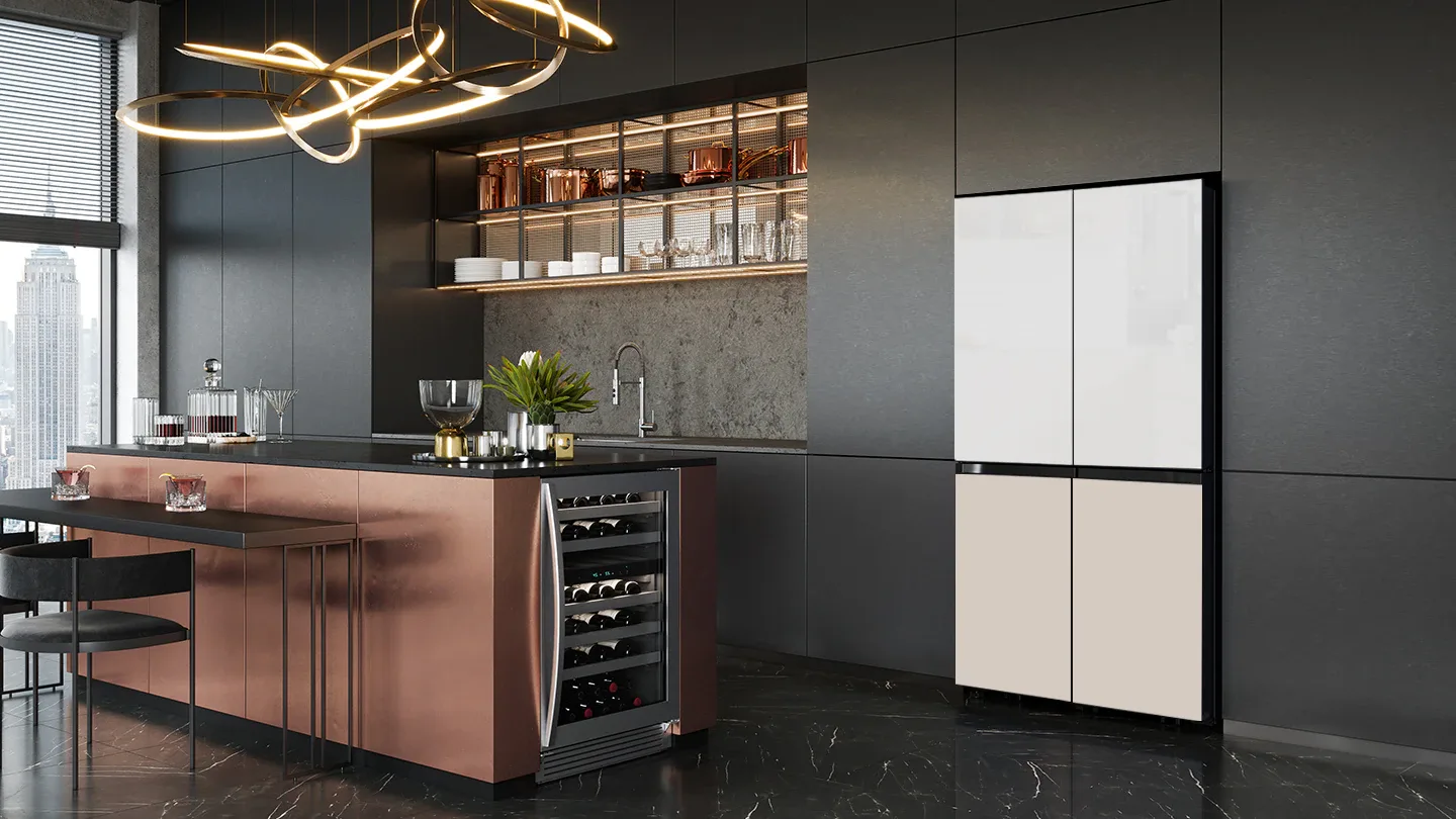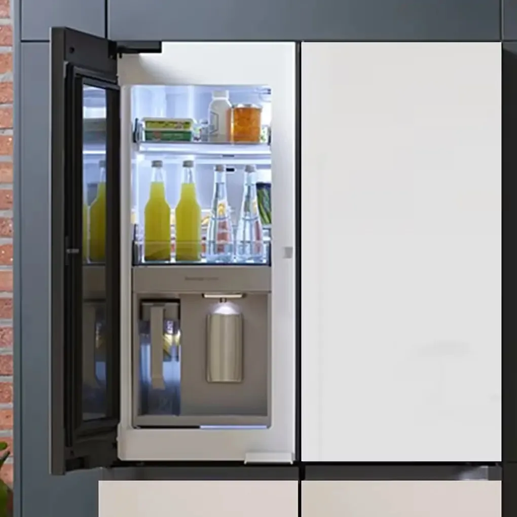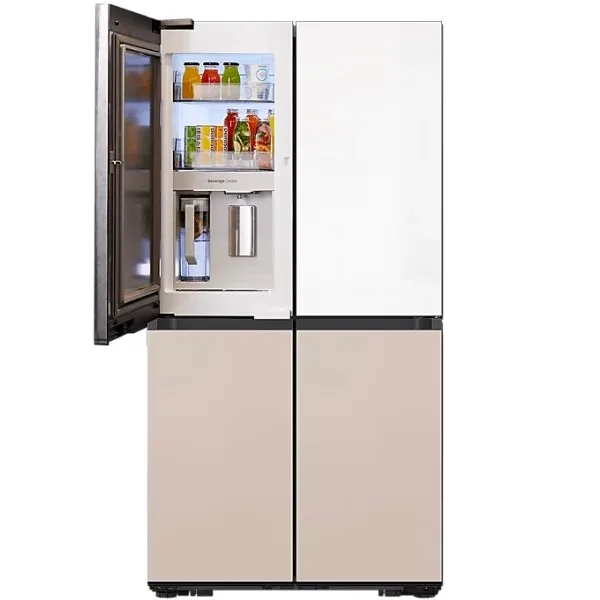 Thiết kế phẳng và mặt kính màu trắng thạch anh kết hợp với màu nâu be thời thượng, tạo nên sự hài hoà và phù hợp với mọi phong cách bếp. Cửa tủ lạnh 4 cánh được làm từ chất liệu kính Bespoke bóng bẩy, chịu lực tốt và có độ bền cao theo thời gian.