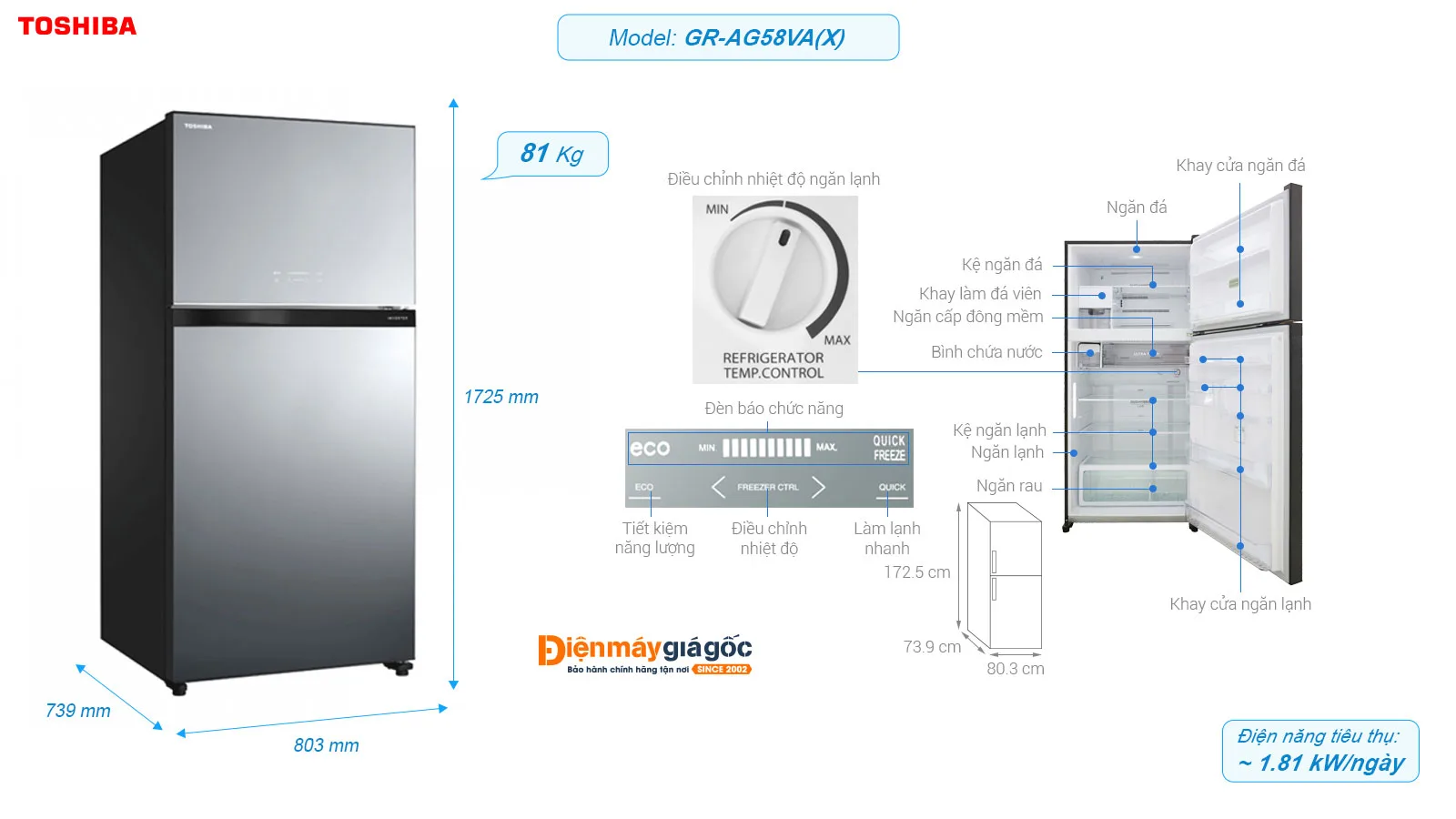 | KÍCH THƯỚC | Cao 172.5 cm - Rộng 80.3 cm - Sâu 73.9 cm - Nặng 81 kg |