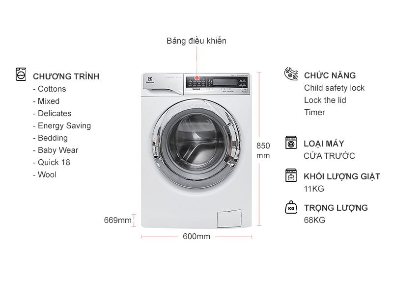 MÁY GIẶT ELECTROLUX 9,5KG INVERTER CỬA TRƯỚC EWF9523BD có thiết kế tinh tế sang trọng làm sáng không gian của gia đình bạn. Khối lượng giặt 9,5 kg phù hợp cho những gia đình có từ 6 thành viên trở lên.