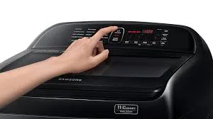 Máy giặt Samsung Inverter được thiết kế với đường nét tinh tế và bo cong viền mềm mại, tạo nên vẻ ngoài thanh thoát và sang trọng ngay cả khi là máy giặt cửa trên. Ngoài ra, nắp máy giặt được làm bằng kính chịu lực, kết hợp với bảng hiển thị phía sau có nút nhấn tiếng Việt dễ dàng sử dụng.