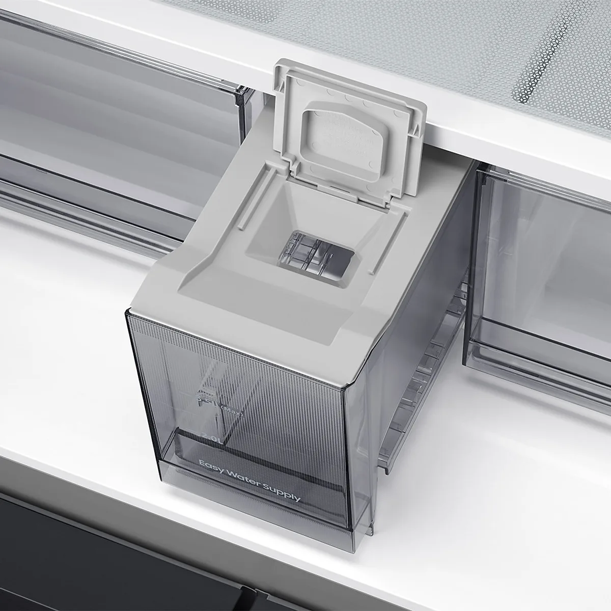 Thiết kế phẳng và mặt kính màu trắng thạch anh kết hợp với màu nâu be thời thượng, tạo nên sự hài hoà và phù hợp với mọi phong cách bếp. Cửa tủ lạnh 4 cánh được làm từ chất liệu kính Bespoke bóng bẩy, chịu lực tốt và có độ bền cao theo thời gian.