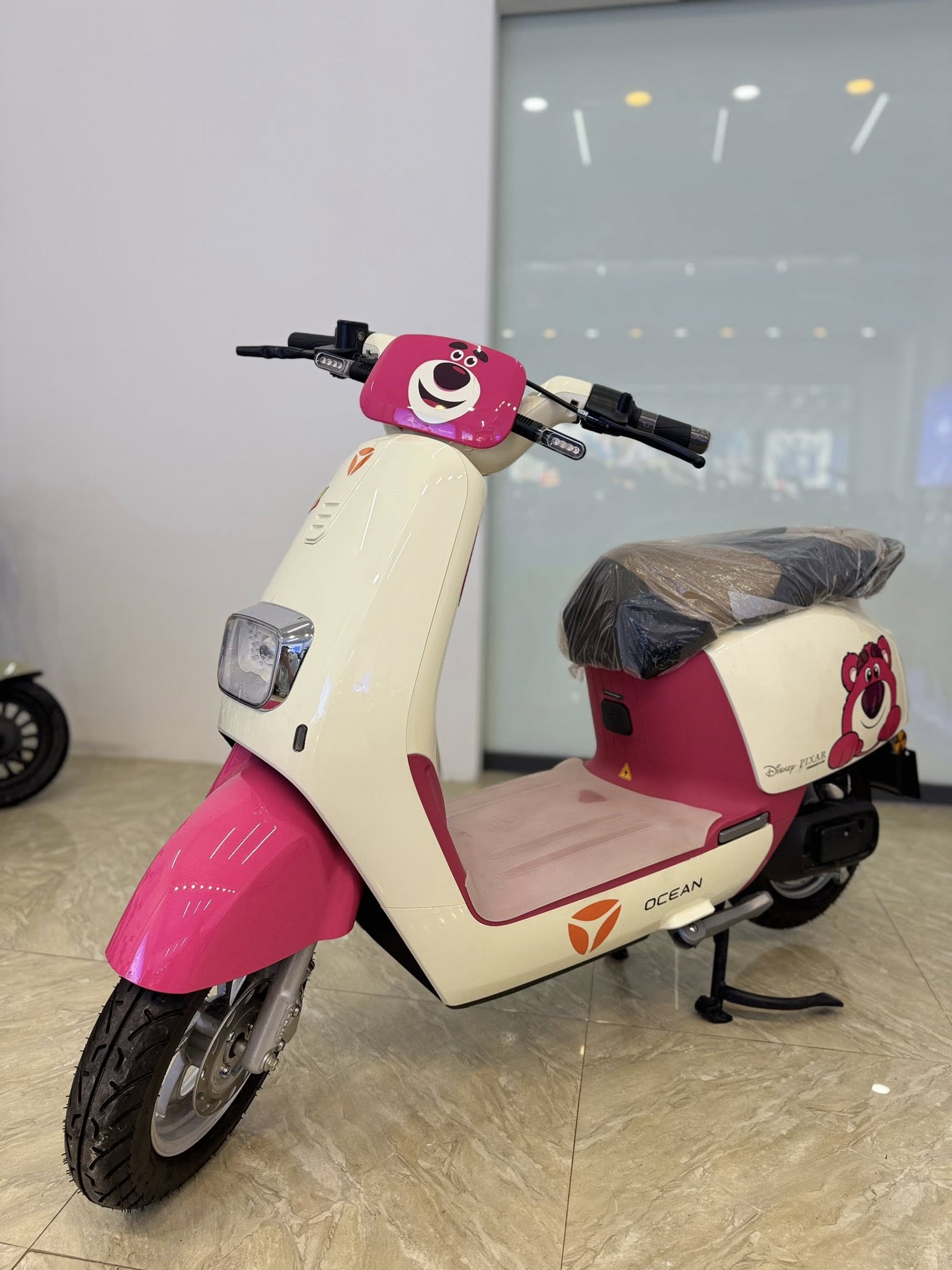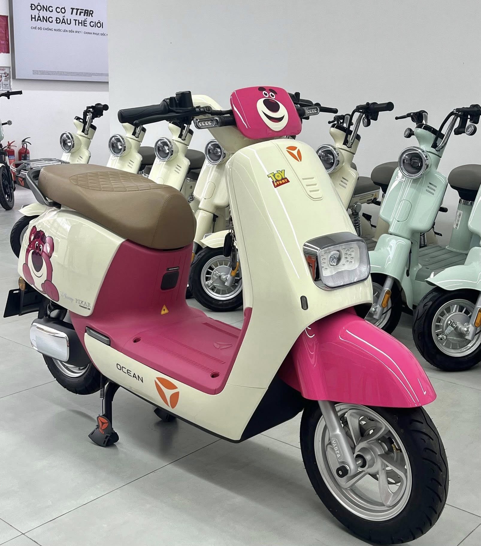 Yadea Ocean Gấu Dâu gây ấn tượng ngay từ cái nhìn đầu tiên với thiết kế hoạt hình “Gấu Dâu” siêu dễ thương, kết hợp màu sắc tươi sáng như hồng pastel, xanh mint, trắng kem... phù hợp cho giới trẻ, đặc biệt là các bạn nữ. Từng chi tiết được chăm chút tỉ mỉ, từ đèn LED bo tròn, tay lái thời trang cho đến logo Gấu Dâu nổi bật – tạo nên sự khác biệt và nổi bật giữa đám đông.
